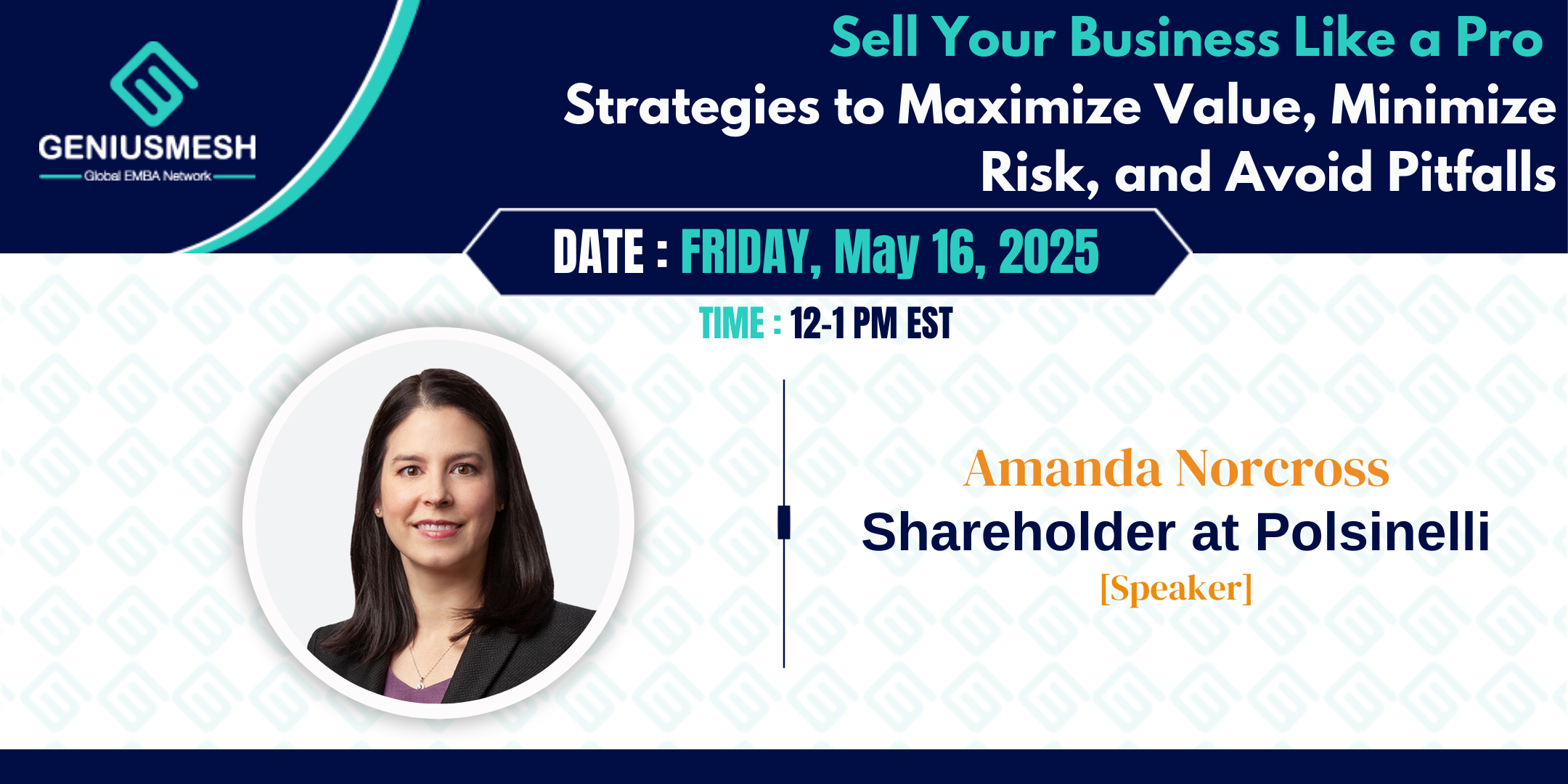 At GeniusMesh, we recently hosted a session on selling your business like a pro with Amanda Norcross, a shareholder at national law firm Polsinelli, focused on one of the most important milestones in a founder’s journey: selling your business. With her deep experience in mergers and acquisitions, Amanda walked our executive audience through the key strategies, decisions, and mistakes to watch for when preparing for a successful exit.
